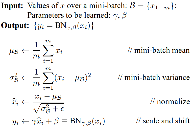 - 식에 대한 더 자세한 설명은 Batch Normalization: Accelerating Deep Network Training b y Reducing Internal Covariate Shift를 참고하자.